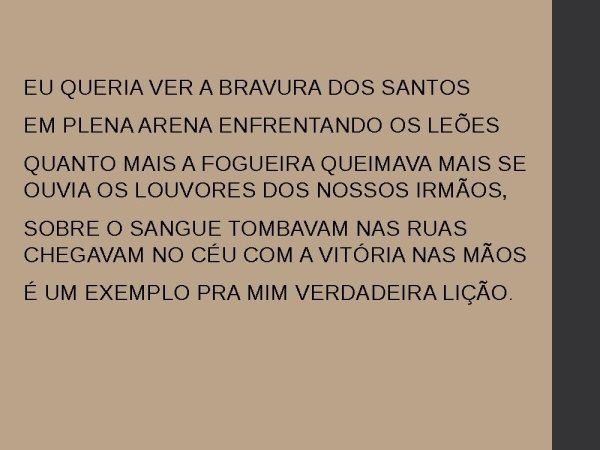 - EU QUERIA VER A BRAVURA DOS SANTOS EM PLENA ARENA ENFRENTANDO OS LEÕES QUANTO MAIS A FOGUEIRA QUEIMAVA MAIS SE OUVIA OS LOUVORES DOS NOSSOS IRMÃOS,SOBRE O SANGUE TOMBAVAM NAS RUAS CHEGAVAM NO CÉU COM A VITÓRIA NAS MÃOS É UM EXEMPLO PRA MIM VERDADEIRA LIÇÃO.