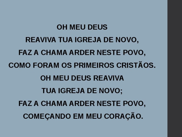 - OH MEU DEUS REAVIVA TUA IGREJA DE NOVO, FAZ A CHAMA ARDER NESTE POVO, COMO FORAM OS PRIMEIROS CRISTÃOS. OH MEU DEUS REAVIVA TUA IGREJA DE NOVO; FAZ A CHAMA ARDER NESTE POVO, COMEÇANDO EM MEU CORAÇÃO.