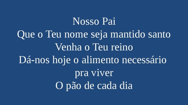 - Nosso PaiQue o Teu nome seja mantido santoVenha o Teu reinoDá-nos hoje o alimento necessário pra viverO pão de cada dia