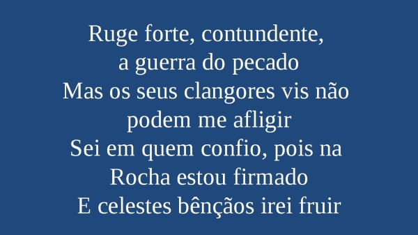 - Ruge forte, contundente, a guerra do pecadoMas os seus clangores vis não podem me afligirSei em quem confio, pois na Rocha estou firmadoE celestes bênçãos irei fruir
