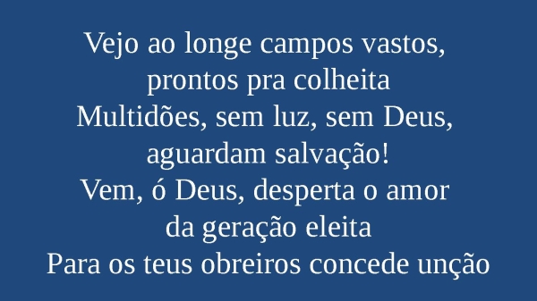 - Vejo ao longe campos vastos, prontos pra colheitaMultidões, sem luz, sem Deus, aguardam salvação!Vem, ó Deus, desperta o amor da geração eleitaPara os teus obreiros concede unção