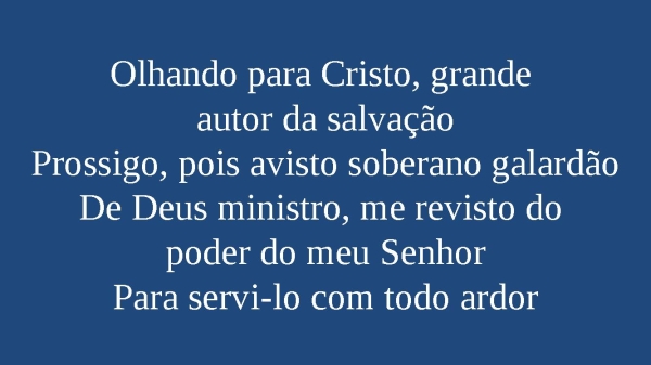 - Olhando para Cristo, grande autor da salvaçãoProssigo, pois avisto soberano galardãoDe Deus ministro, me revisto do poder do meu SenhorPara servi-lo com todo ardor