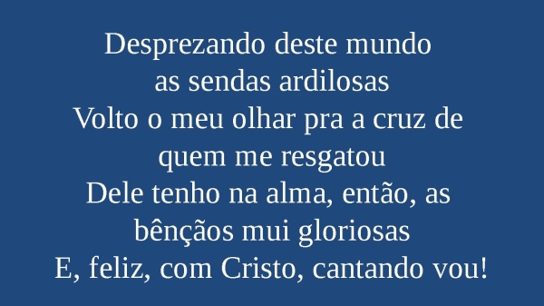 - Desprezando deste mundo as sendas ardilosasVolto o meu olhar pra a cruz de quem me resgatouDele tenho na alma, então, as bênçãos mui gloriosasE, feliz, com Cristo, cantando vou!