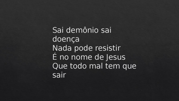 - Sai demônio sai doençaNada pode resistirÉ no nome de JesusQue todo mal tem que sair
