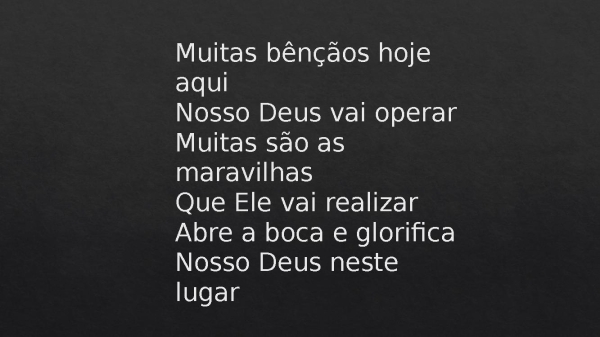 - Muitas bênçãos hoje aquiNosso Deus vai operarMuitas são as maravilhasQue Ele vai realizarAbre a boca e glorificaNosso Deus neste lugar