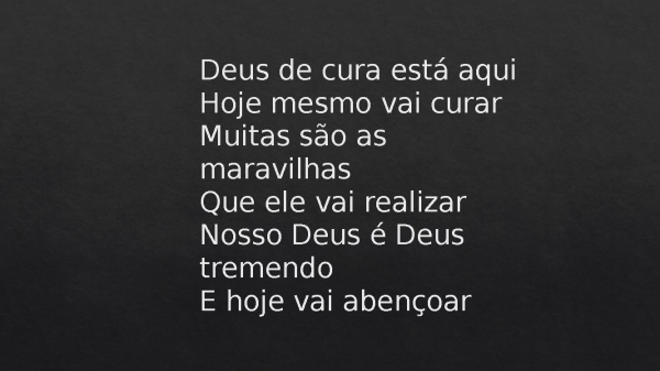 - Deus de cura está aquiHoje mesmo vai curarMuitas são as maravilhasQue ele vai realizarNosso Deus é Deus tremendoE hoje vai abençoar