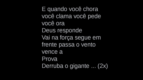 - E quando você chora você clama você pede você oraDeus respondeVai na força segue em frente passa o vento vence aProvaDerruba o gigante ... (2x)