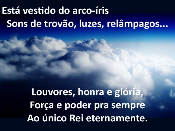 - Está vestido do arco-íris Sons de trovão, luzes, relâmpagos...Louvores, honra e glória,Força e poder pra sempreAo único Rei eternamente.