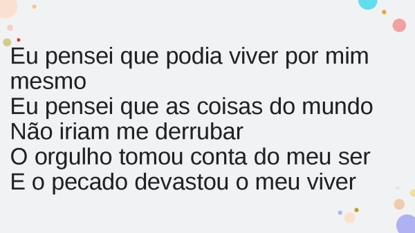 - Eu pensei que podia viver por mim mesmoEu pensei que as coisas do mundoNão iriam me derrubarO orgulho tomou conta do meu serE o pecado devastou o meu viver