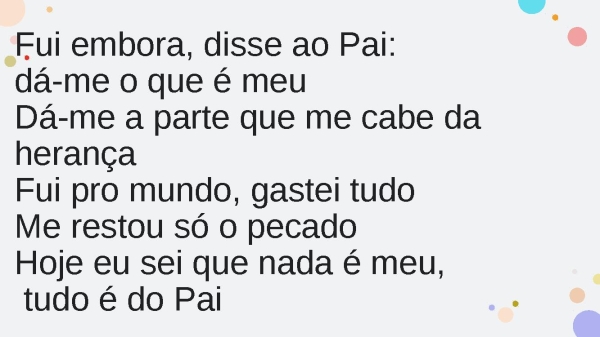 - Fui embora, disse ao Pai: dá-me o que é meuDá-me a parte que me cabe da herançaFui pro mundo, gastei tudoMe restou só o pecadoHoje eu sei que nada é meu, tudo é do Pai