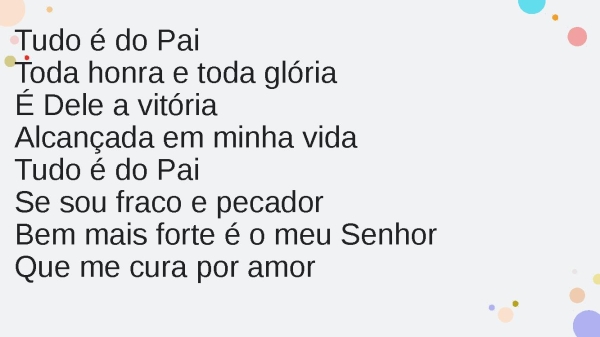 - Tudo é do PaiToda honra e toda glóriaÉ Dele a vitóriaAlcançada em minha vidaTudo é do PaiSe sou fraco e pecadorBem mais forte é o meu SenhorQue me cura por amor