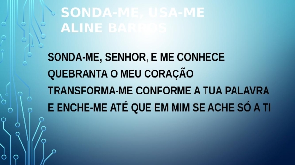 - Sonda-me, Usa-meAline BarrosSonda-me, Senhor, e me conheceQuebranta o meu coraçãoTransforma-me conforme a Tua palavraE enche-me até que em mim se ache só a Ti