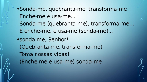 - Sonda-me, quebranta-me, transforma-meEnche-me e usa-me...Sonda-me (quebranta-me), transforma-me...E enche-me, e usa-me (sonda-me)...sonda-me, Senhor!(Quebranta-me, transforma-me)Toma nossas vidas!(Enche-me e usa-me) sonda-me