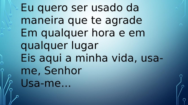 - Eu quero ser usado da maneira que te agradeEm qualquer hora e em qualquer lugarEis aqui a minha vida, usa-me, SenhorUsa-me...