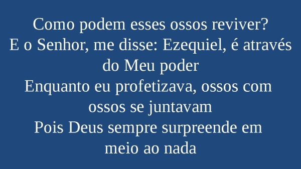 - Como podem esses ossos reviver?E o Senhor, me disse: Ezequiel, é através do Meu poderEnquanto eu profetizava, ossos com ossos se juntavamPois Deus sempre surpreende em meio ao nada
