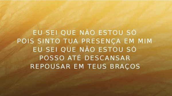 - Eu sei que não estou sóPois sinto Tua presença em mimEu sei que não estou sóPosso até descansarRepousar em teus braços