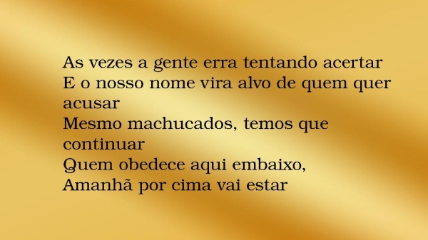 - As vezes a gente erra tentando acertarE o nosso nome vira alvo de quem quer acusarMesmo machucados, temos que continuarQuem obedece aqui embaixo,Amanhã por cima vai estar