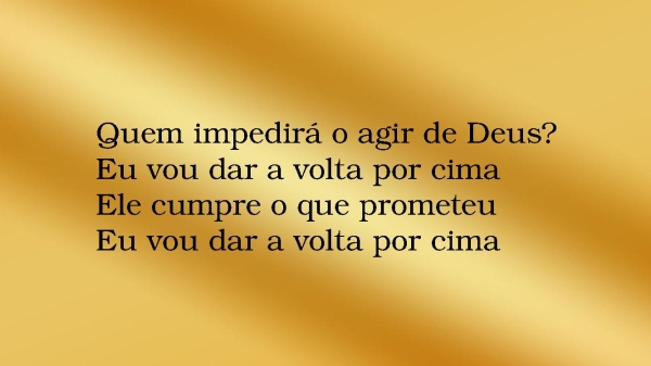 - Quem impedirá o agir de Deus?Eu vou dar a volta por cimaEle cumpre o que prometeuEu vou dar a volta por cima