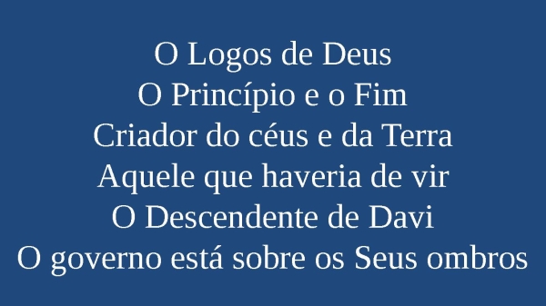 - O Logos de DeusO Princípio e o FimCriador do céus e da TerraAquele que haveria de virO Descendente de DaviO governo está sobre os Seus ombros