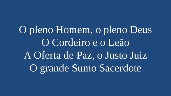 - O pleno Homem, o pleno DeusO Cordeiro e o LeãoA Oferta de Paz, o Justo JuizO grande Sumo Sacerdote