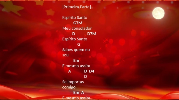- [Primeira Parte]Espírito SantoG7MMeu consoladorD D7MEspírito SantoGSabes quem eu souEmE mesmo assimA D D4 DSe importas comigoEm AE mesmo assimD D4 DMoras em mim