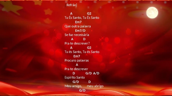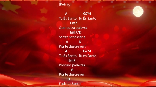 - [Refrão]A G2Tu És Santo, Tu És SantoEm7Que outra palavraEm7/DSe faz necessáriaA DPra te descrever?A G2Tu és Santo, Tu és SantoEm7Procuro palavrasAPra te descreverD G/D A/DEspirito SantoDmeu abrigoG/DMeu amigo,G/D