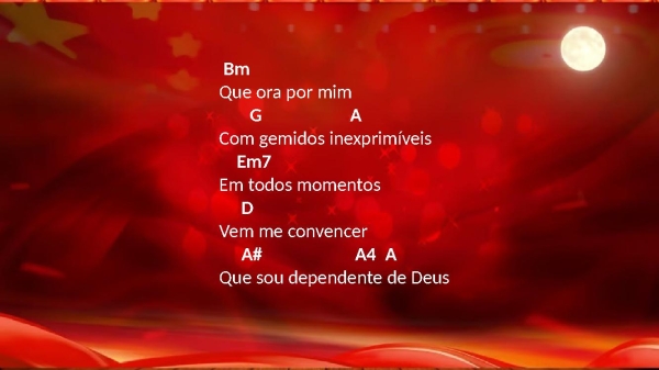 - BmQue ora por mimG ACom gemidos inexprimíveisEm7Em todos momentosDVem me convencerA# A4 AQue sou dependente de Deus