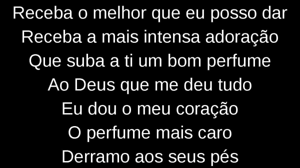 - Receba o melhor que eu posso darReceba a mais intensa adoraçãoQue suba a ti um bom perfumeAo Deus que me deu tudoEu dou o meu coraçãoO perfume mais caroDerramo aos seus pés