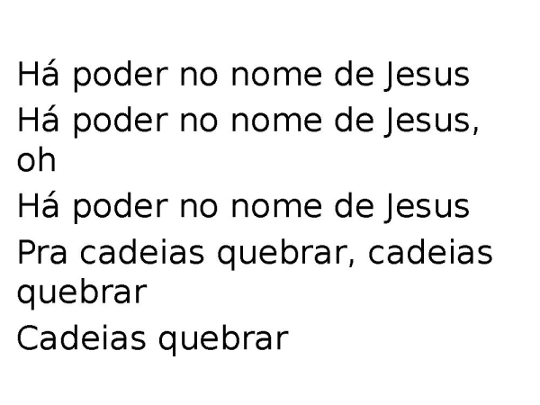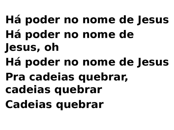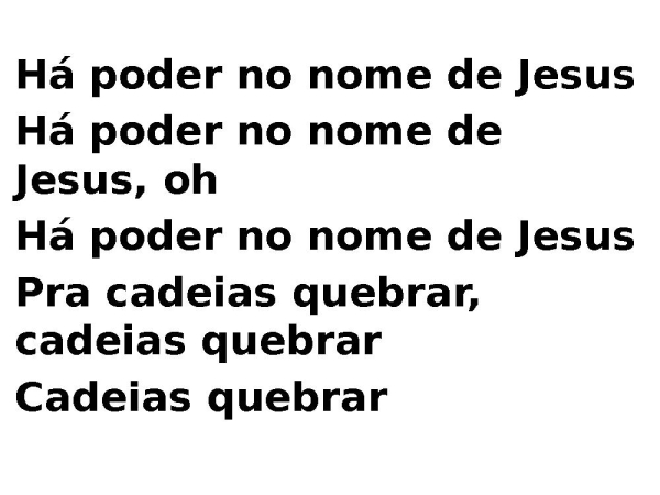 - Há poder no nome de JesusHá poder no nome de Jesus, ohHá poder no nome de JesusPra cadeias quebrar, cadeias quebrarCadeias quebrar
