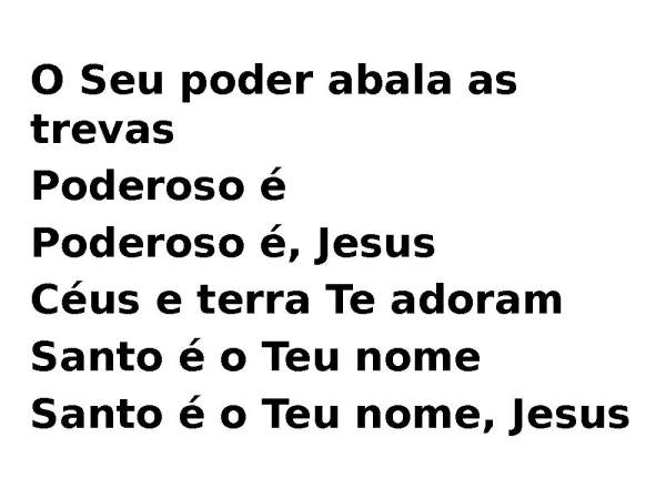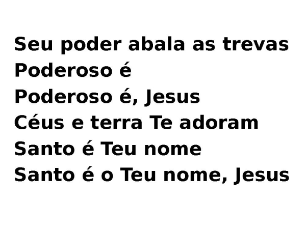 - O Seu poder abala as trevasPoderoso éPoderoso é, JesusCéus e terra Te adoramSanto é o Teu nomeSanto é o Teu nome, Jesus