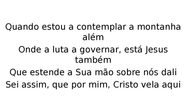 - Quando estou a contemplar a montanha alémOnde a luta a governar, está Jesus tambémQue estende a Sua mão sobre nós daliSei assim, que por mim, Cristo vela aqui