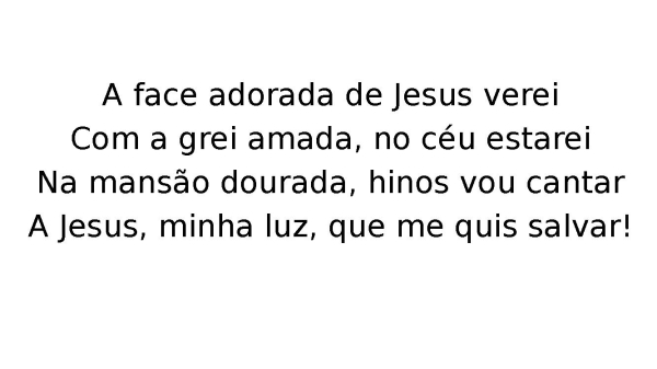 - A face adorada de Jesus vereiCom a grei amada, no céu estareiNa mansão dourada, hinos vou cantarA Jesus, minha luz, que me quis salvar!