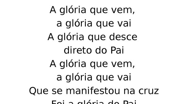 - A glória que vem, a glória que vaiA glória que desce direto do PaiA glória que vem, a glória que vaiQue se manifestou na cruzFoi a glória do Pai
