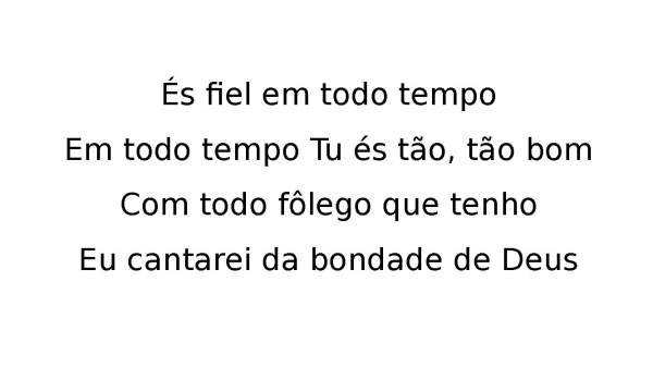 - És fiel em todo tempoEm todo tempo Tu és tão, tão bomCom todo fôlego que tenhoEu cantarei da bondade de Deus