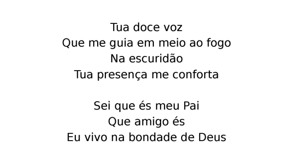 - Tua doce vozQue me guia em meio ao fogoNa escuridãoTua presença me confortaSei que és meu PaiQue amigo ésEu vivo na bondade de Deus