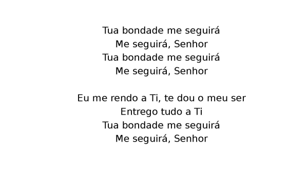 - Tua bondade me seguiráMe seguirá, SenhorTua bondade me seguiráMe seguirá, SenhorEu me rendo a Ti, te dou o meu serEntrego tudo a TiTua bondade me seguiráMe seguirá, Senhor