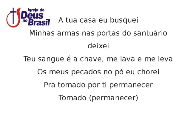- A tua casa eu busqueiMinhas armas nas portas do santuário deixeiTeu sangue é a chave, me lava e me levaOs meus pecados no pó eu choreiPra tomado por ti permanecerTomado (permanecer)
