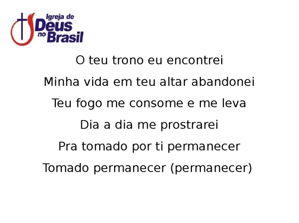 - O teu trono eu encontreiMinha vida em teu altar abandoneiTeu fogo me consome e me levaDia a dia me prostrareiPra tomado por ti permanecerTomado permanecer (permanecer)