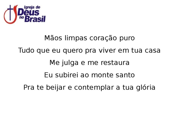 - Mãos limpas coração puroTudo que eu quero pra viver em tua casaMe julga e me restauraEu subirei ao monte santoPra te beijar e contemplar a tua glória