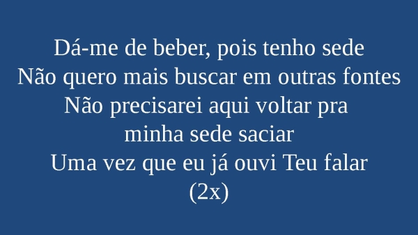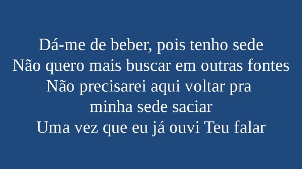 - Dá-me de beber, pois tenho sedeNão quero mais buscar em outras fontesNão precisarei aqui voltar pra minha sede saciarUma vez que eu já ouvi Teu falar