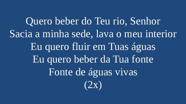 - Quero beber do Teu rio, SenhorSacia a minha sede, lava o meu interiorEu quero fluir em Tuas águasEu quero beber da Tua fonteFonte de águas vivas(2x)