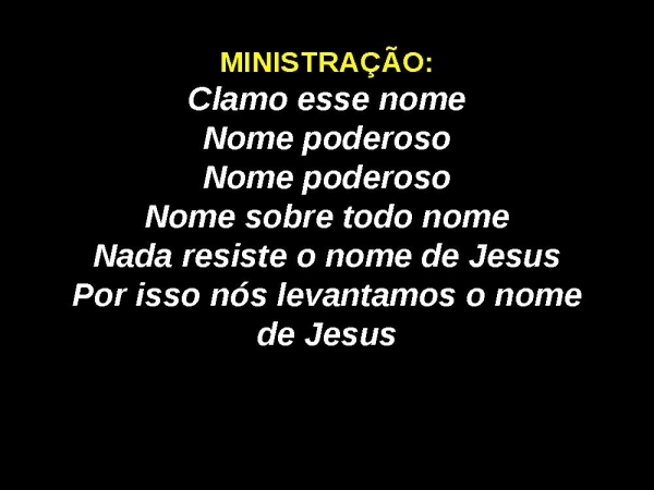 - MINISTRAÇÃO:Clamo esse nomeNome poderosoNome poderosoNome sobre todo nomeNada resiste o nome de JesusPor isso nós levantamos o nome de Jesus