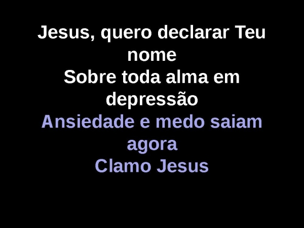 - Jesus, quero declarar Teu nomeSobre toda alma em depressãoAnsiedade e medo saiam agoraClamo Jesus