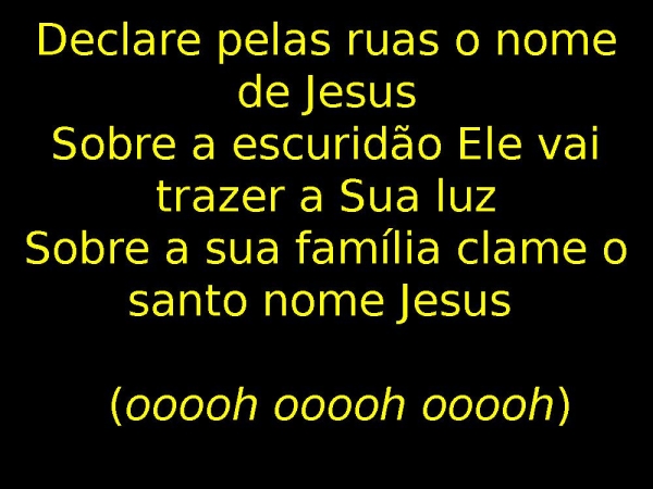 - Declare pelas ruas o nome de JesusSobre a escuridão Ele vai trazer a Sua luzSobre a sua família clame o santo nome Jesus (ooooh ooooh ooooh)