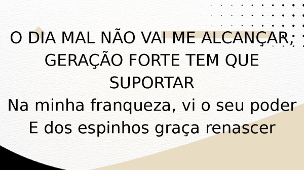 - O DIA MAL NÃO VAI ME ALCANÇAR, GERAÇÃO FORTE TEM QUE SUPORTARNa minha franqueza, vi o seu poderE dos espinhos graça renascer