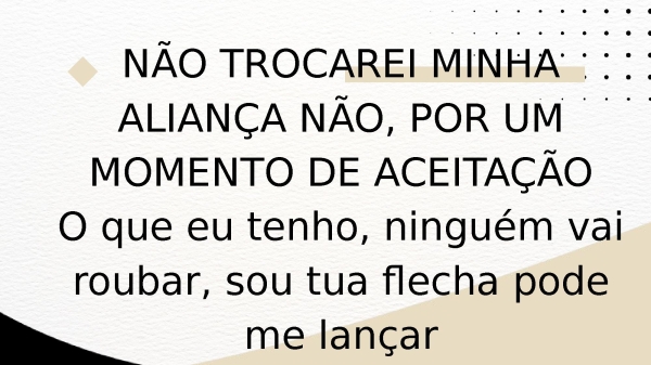 - NÃO TROCAREI MINHA ALIANÇA NÃO, POR UM MOMENTO DE ACEITAÇÃOO que eu tenho, ninguém vai roubar, sou tua flecha pode me lançar