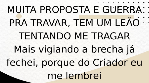 - MUITA PROPOSTA E GUERRA PRA TRAVAR, TEM UM LEÃO TENTANDO ME TRAGARMais vigiando a brecha já fechei, porque do Criador eu me lembrei
