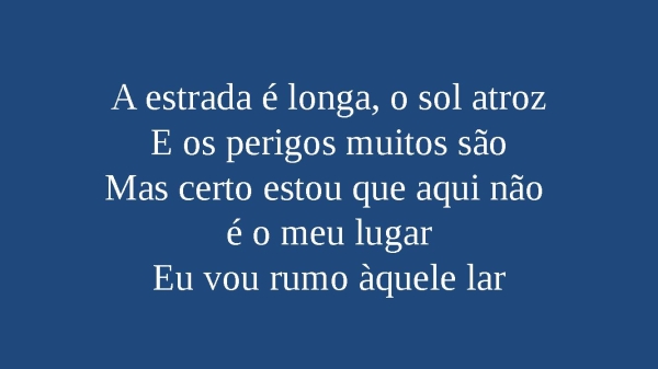 - A estrada é longa, o sol atrozE os perigos muitos sãoMas certo estou que aqui não é o meu lugarEu vou rumo àquele lar