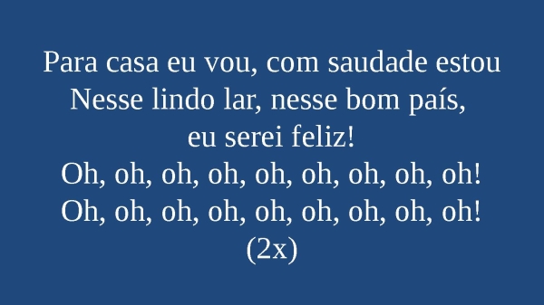 - Para casa eu vou, com saudade estouNesse lindo lar, nesse bom país, eu serei feliz!Oh, oh, oh, oh, oh, oh, oh, oh, oh!Oh, oh, oh, oh, oh, oh, oh, oh, oh!(2x)
