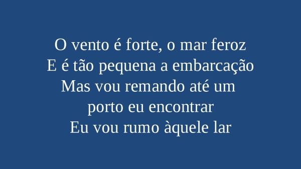 - O vento é forte, o mar ferozE é tão pequena a embarcaçãoMas vou remando até um porto eu encontrarEu vou rumo àquele lar